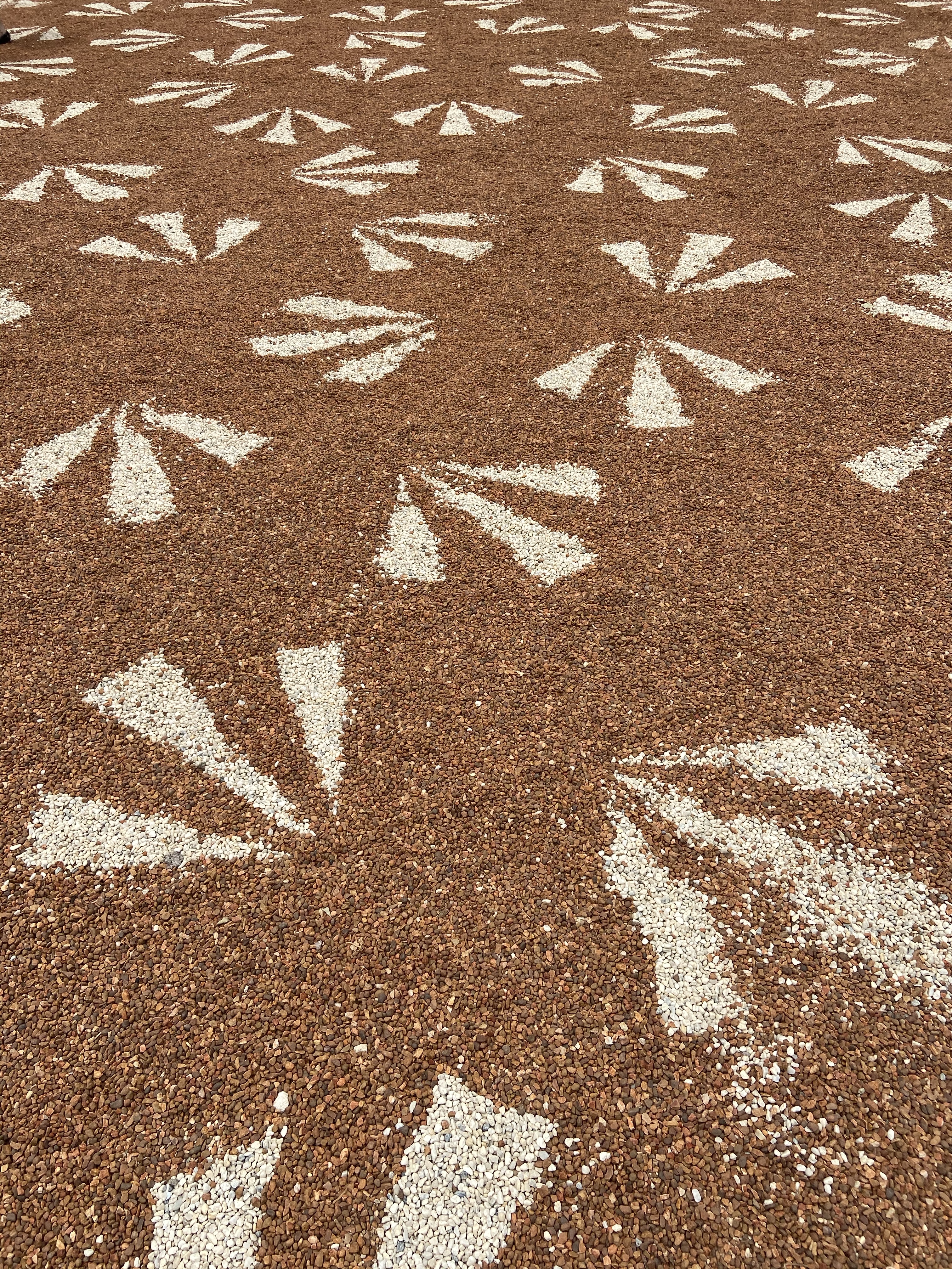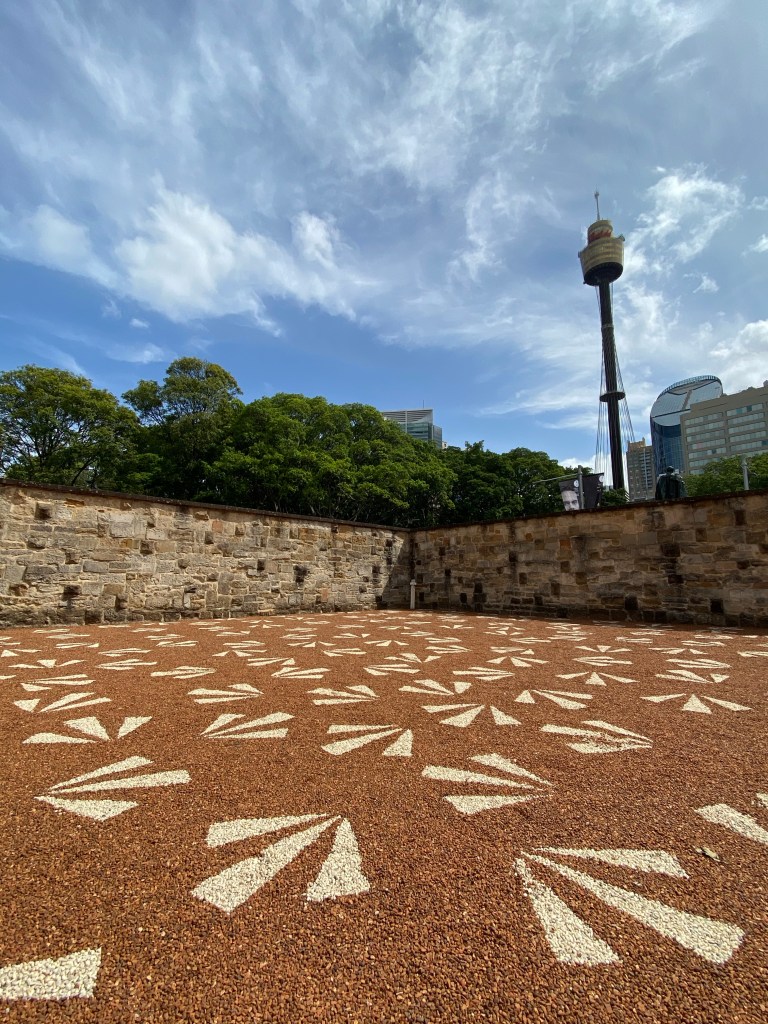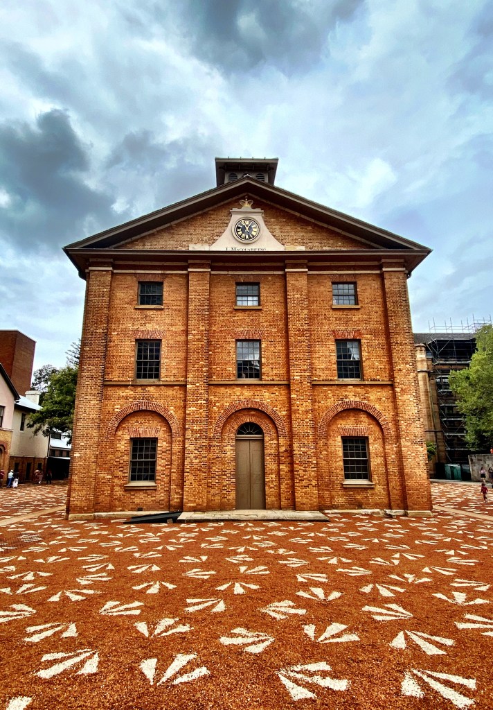 Walking through the entry to Hyde Park Barracks, Jones’ installation seems so ‘at home’ that it isn’t apparent at first that the striking motif stretching underfoot across the full length and span of the courtyard is a new feature here, albeit surrounding one of Sydney’s oldest buildings.